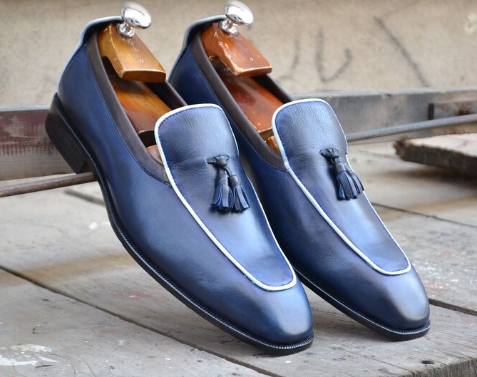 Handmade Shoes Men Dark Blue Plain Tussle Loafers Dress, Formal Leather Shoes