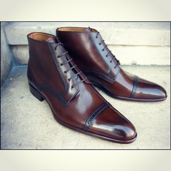 Handmade Bespoke Men's Dark Brown Genuine Leather Dress Up, Cap Toe Ankle High Boots