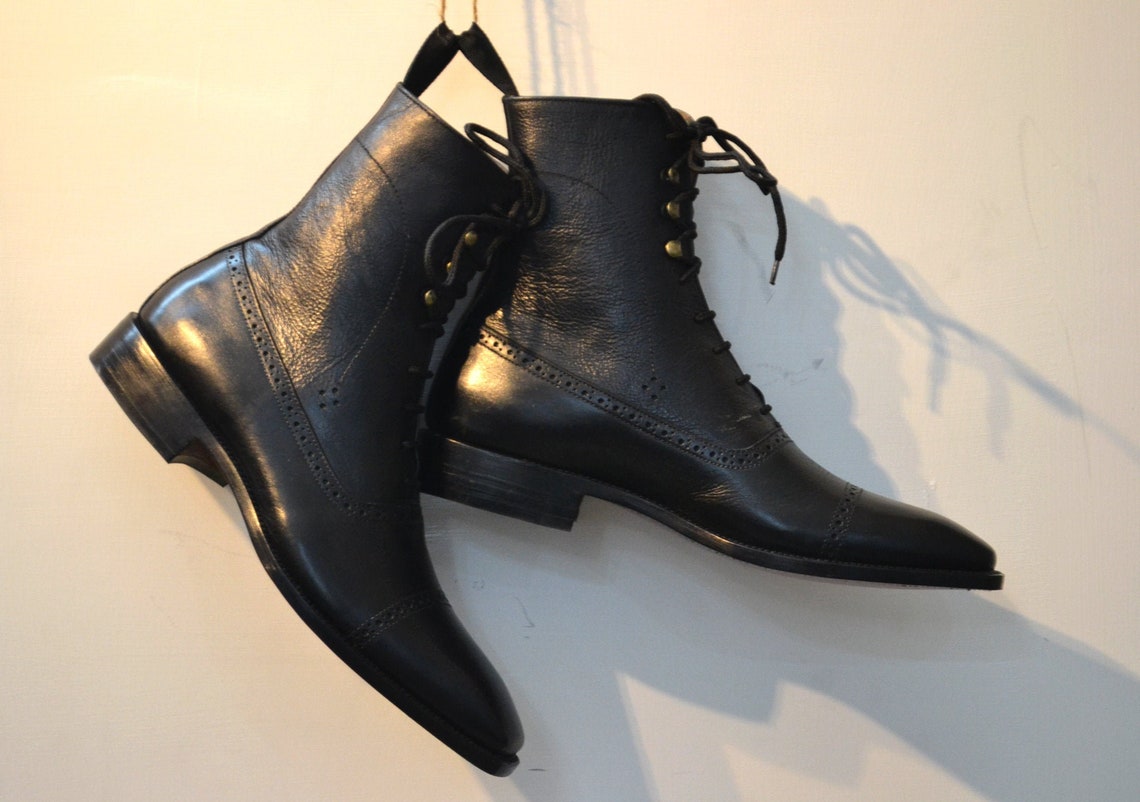 Handmade Bespoke Men's Black Color Genuine Leather Cap Toe Lace Up Ankle High Boots