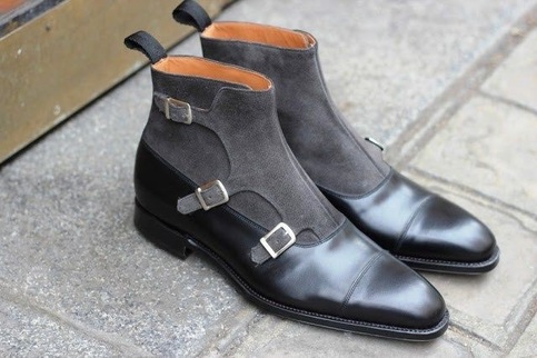 Handmade Bespoke Men's Black Leather & Suede Three Monk Strap Cap Toe Ankle High Boots