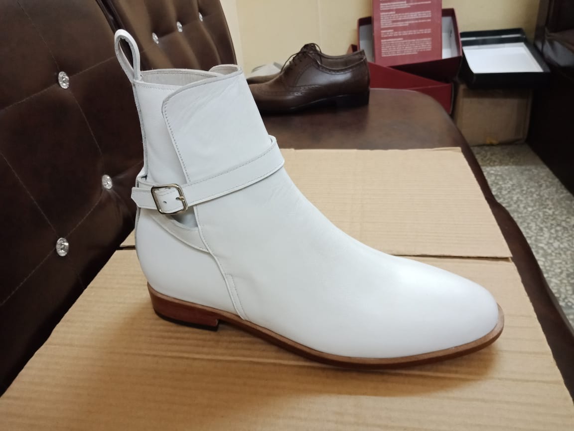 Handmade Bespoke Men's White Color Genuine Leather Singel Monk Strap Jodhpur Ankle High Boots