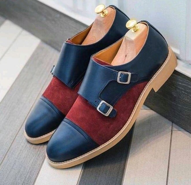 Handmade Bespoke Men's Blue Leather & Burgundy Suede Double Monk Strap Cap Toe Shoes