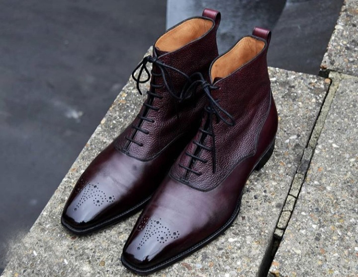 Handmade Bespoke Men's Burgundy Color Genuine Leather Upper Lace Up Brogue Toe Lace Up Ankle High Boots