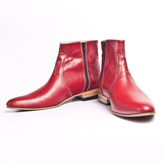 Handmade Bespoke Men's Red Color Genuine Leather Side Zipper Ankle High Boots