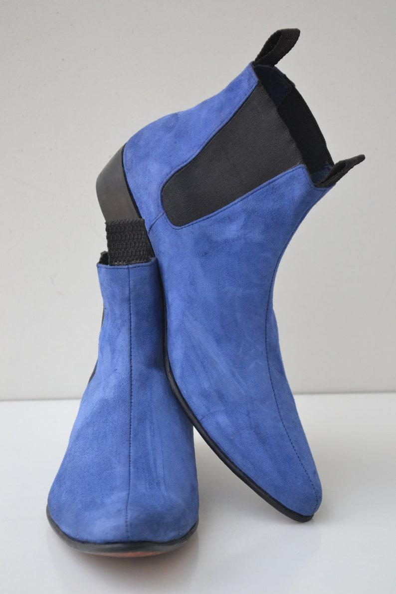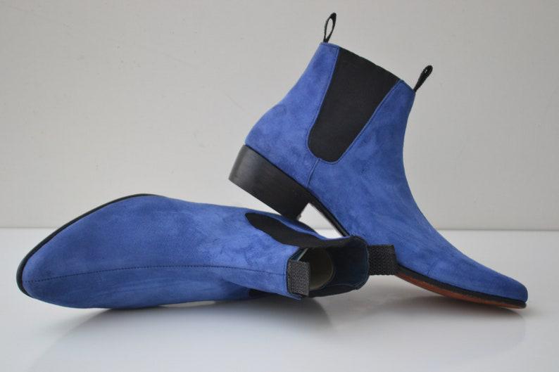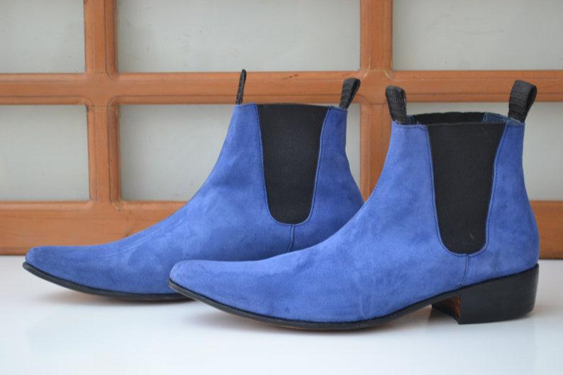 Bespoke Men's Handmade Stylish Royal Blue Suede Casual Ankle High Pointed Toe, Chelsea, Formal Boots