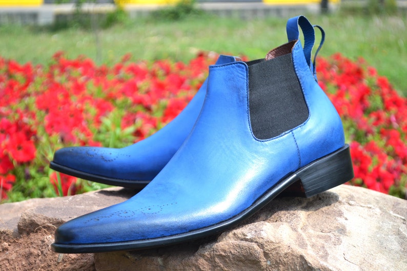 Pure Handmade Men's Black Pointed Toe Blue Leather Ankle High Brogue Boots
