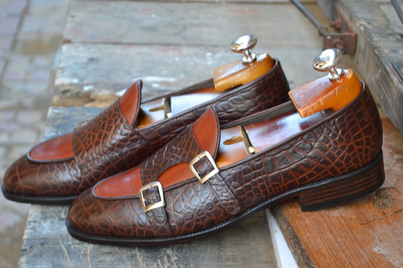 Men's New Genuine Leather Brown Color Alligator Texture Double Buckle Loafers Shoes