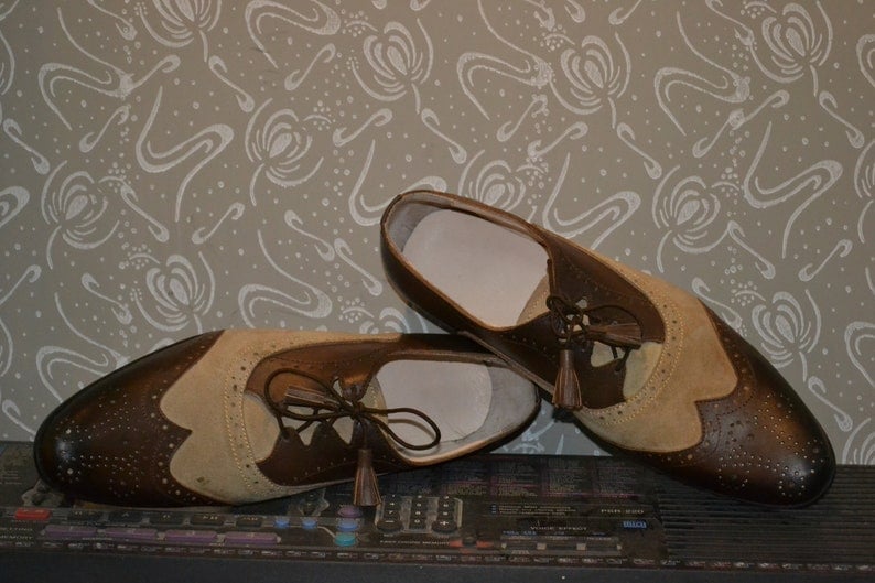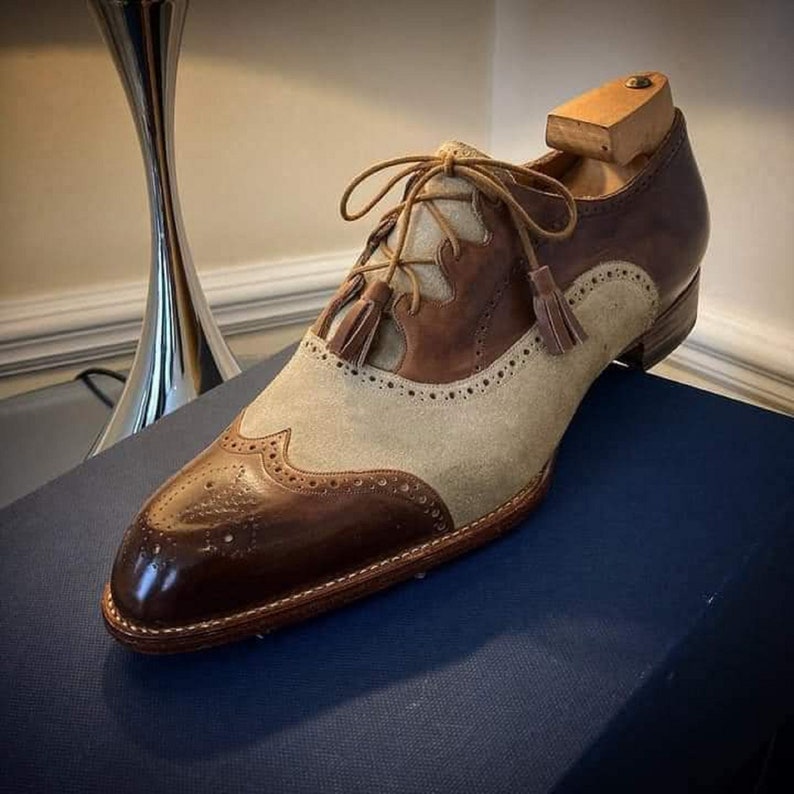Men's New Pure Handmade Brown Leather & Cream Suede Wing Tip Lace Brogue Up Shoes