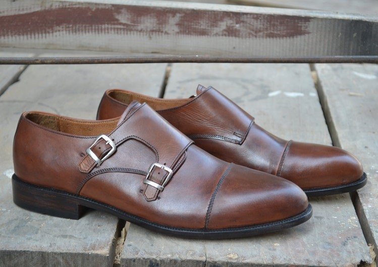 Handmade Shoes Men's Brown Cap Toe Double Buckle Monk Strap Casual, Dress Shoes