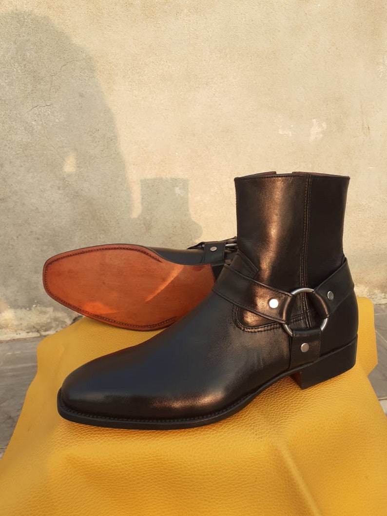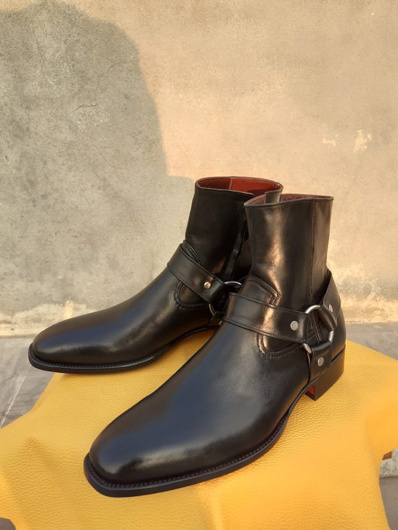 Handcrafted Men's Black Color Ankle High Chelsea Harness Side Zipper Pure Leather, Formal Boots