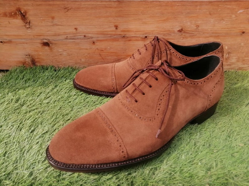 Bespoke Handcrafted Men's Camel Color Genuine Leather Suede Cap Toe Formal, Dress Shoes