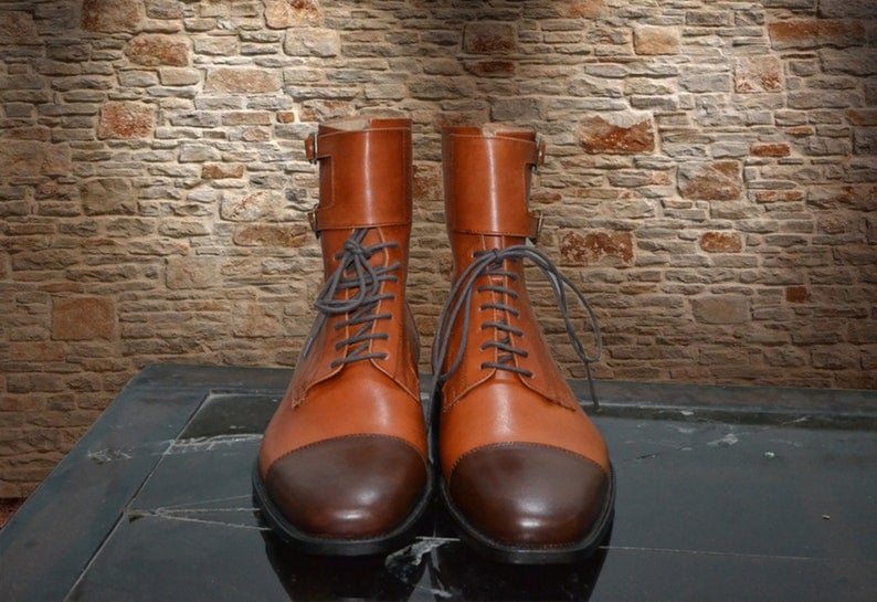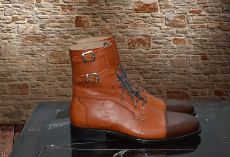 Men's Pure Handmade Brown Color Ankle High Double Monk Strap Lace Up Leather Cap Toe Boots