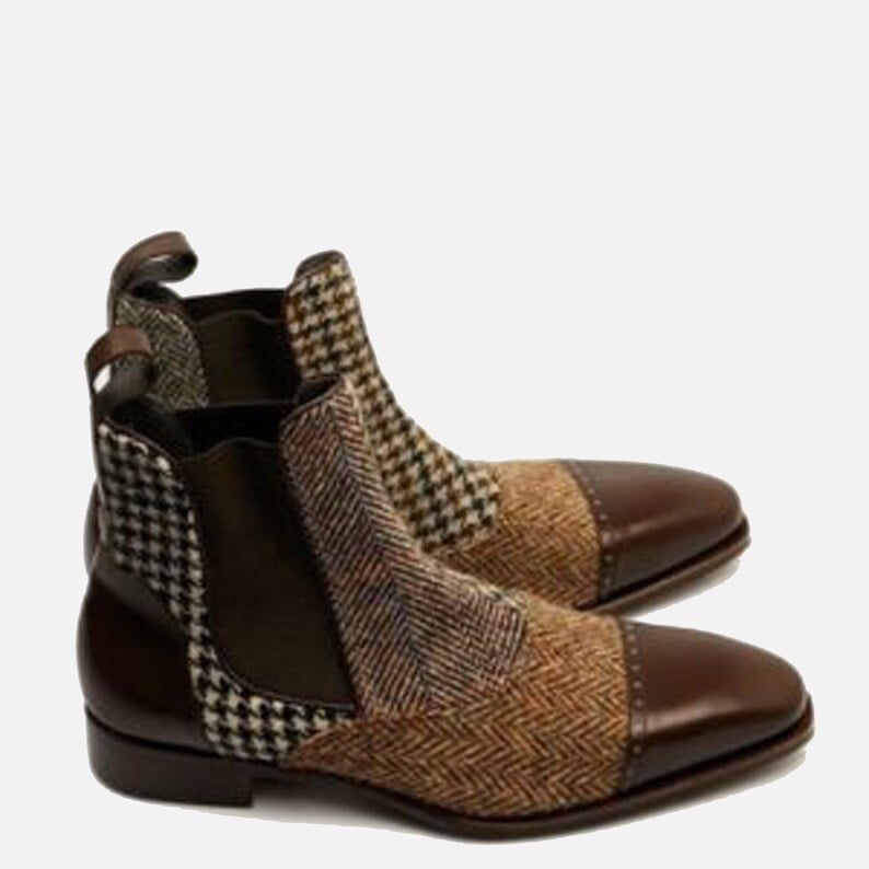 Handmade Menโs Four Tone Tweed & Brown Leather Chelsea Formal Cap Toe Dress Boots