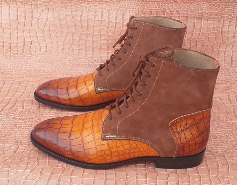 Men's Pure Handmade Tan & Brown Alligator Textured Leather Suede Ankle High Lace Up Boots