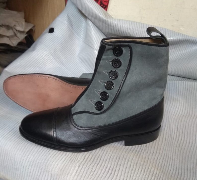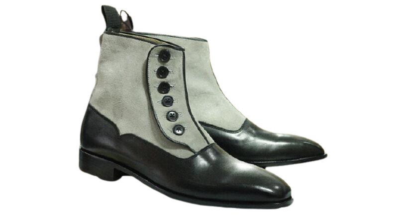 Handmade For Men's Button Top Cap Toe Leather & Suede Boots Gray Black, Dress Formal Boots