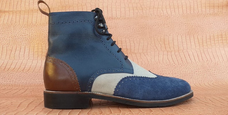Men's Pure Handmade Ankle High Leather & Suede Multi Color Formal Wing Tip Brogue Boots