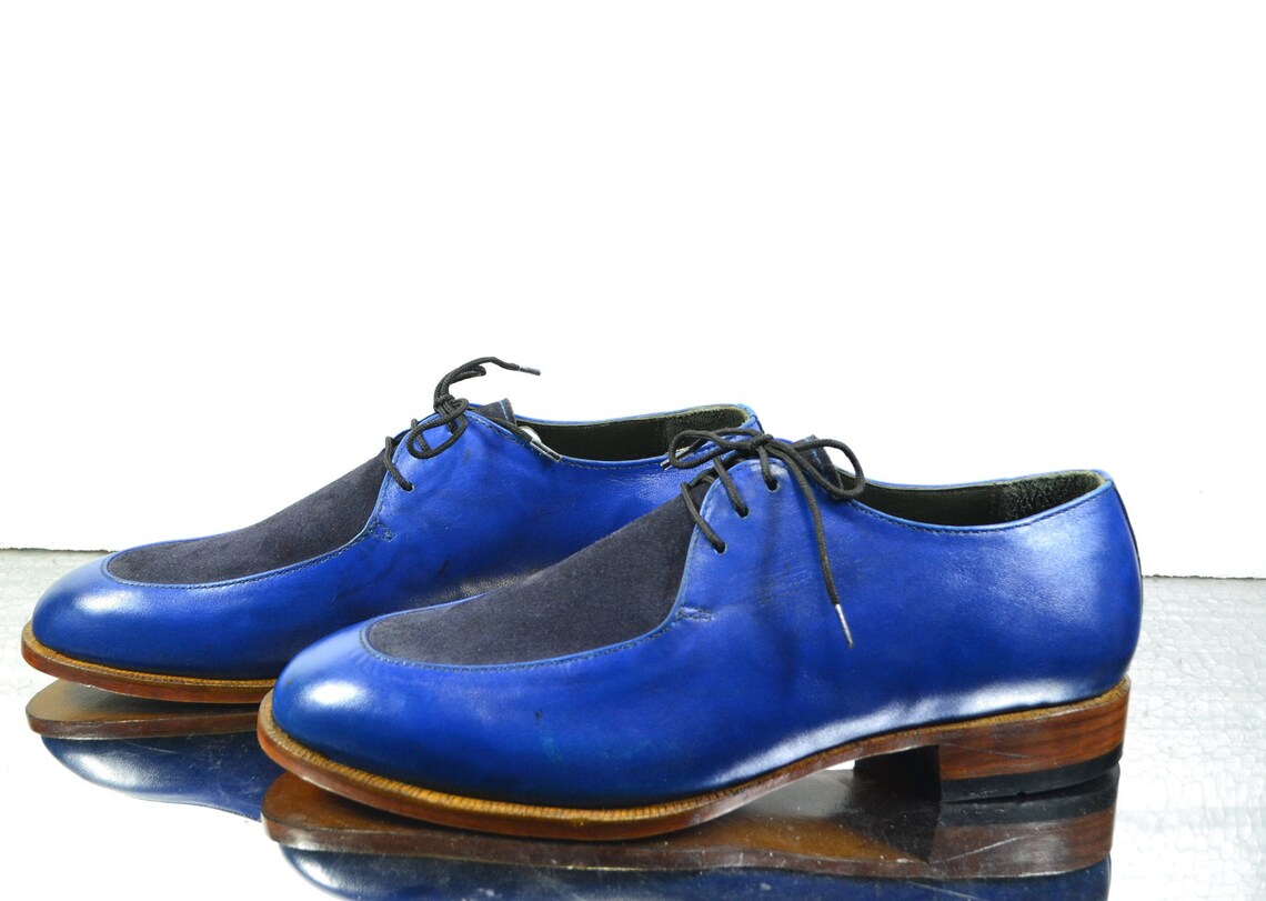 Pure Handmade For Men's Blue Leather & Suede Lace Up Casual Derby Dress Shoes