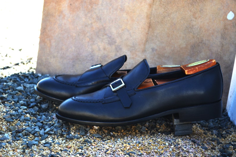 Men's Handmade Black Color Pure Calf Leather Rollover Monk Strap Moccasins Loafers Shoes Formal Dress Shoes