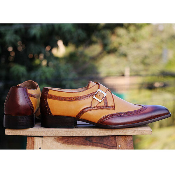 Handmade Men's Genuine Tan, Dark Red Leather Wing Tip Single Monk Strap Shoes