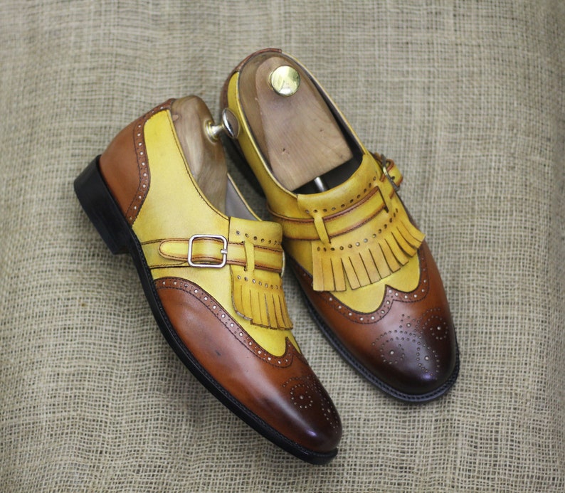 New Purely Handmade Made To Order Yellow & Tan Brown Color Genuine Leather Monk Strap Wing Tip Shoes For Men, Fringe Slip On Loafers For Men
