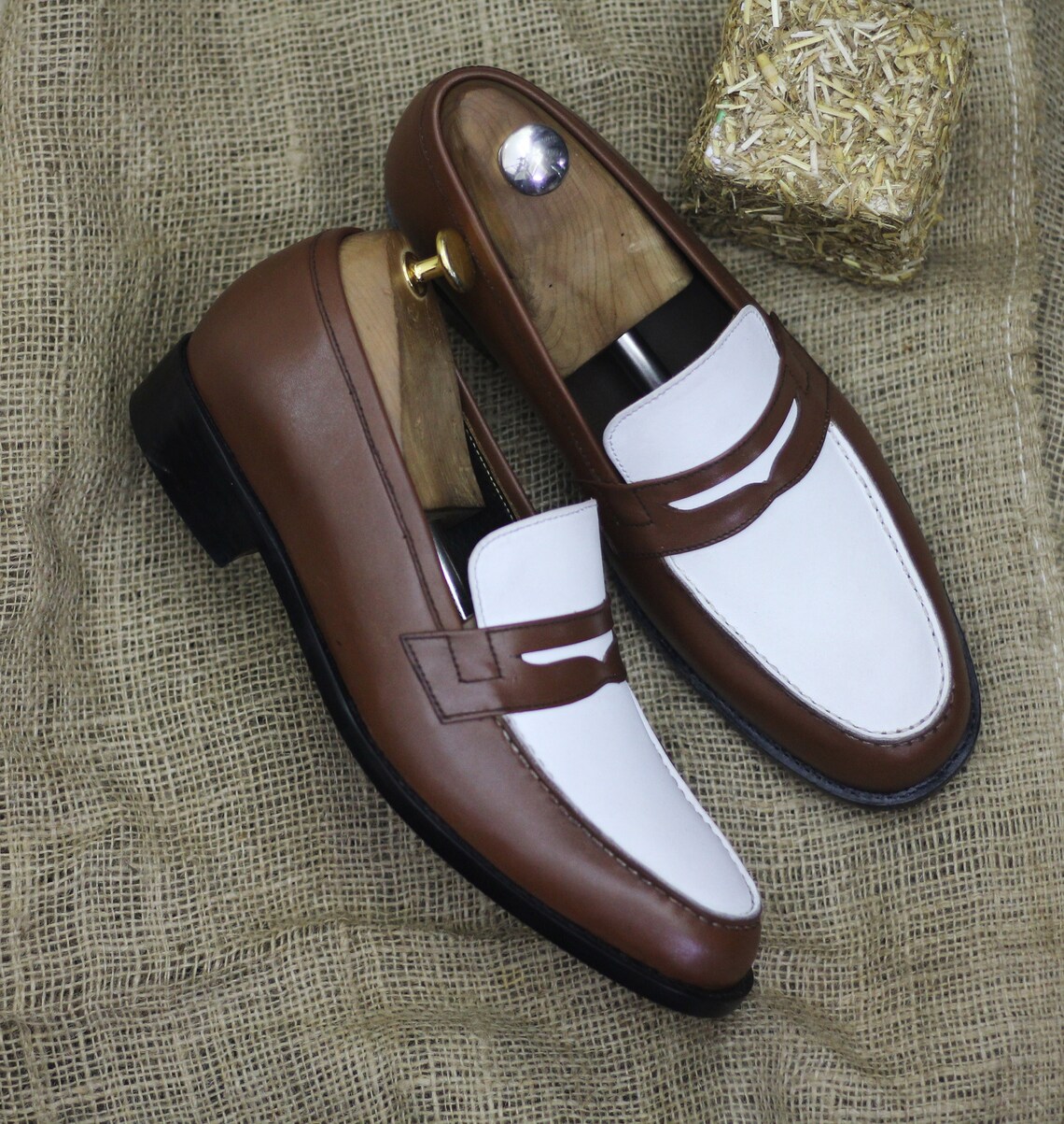 Purely Handmade Brown & White Color Genuine Leather Slip On Loafers For Men, Formal Loafers For Men, Men's Stylish Shoes