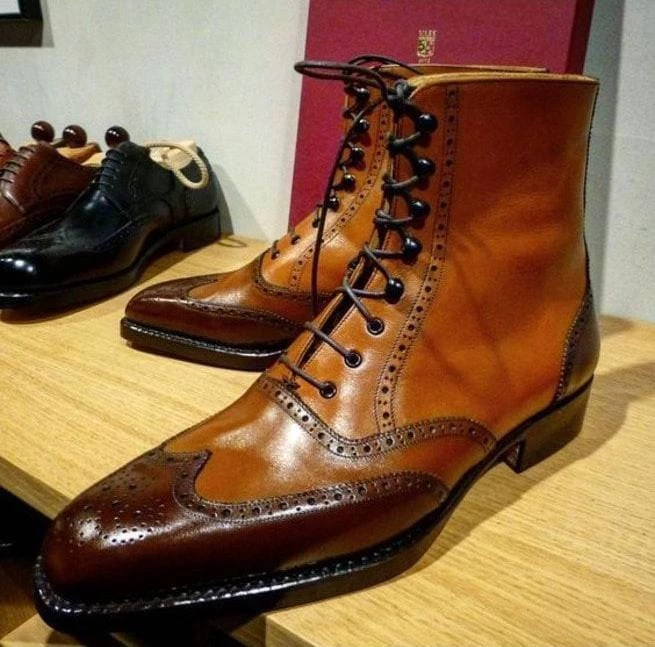 Bespoke Pure Handmade Men's Brown Color Wing Tip , Brogue Toe Hand Panted Ankle High Boots