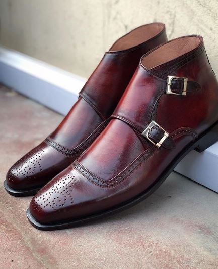Men's New Handmade Pure Leather Brogue Double Monk Strap Square Toe Maroon Color Low Ankle Boots