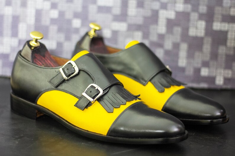 Made To Order Pure Handmade Yellow & Black Double Monk Strap Shoes For Men, Men's Luxury Shoes, Designer Shoes, Men's Buckle Shoes