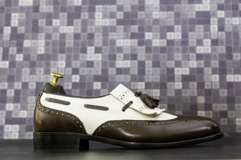 Handmade Men's Made To Order Brown And White Leather Shoes For Men, Tassel Shoes, Handmade Shoes Men, Wing Tip Brogue Toe Shoes For Gents