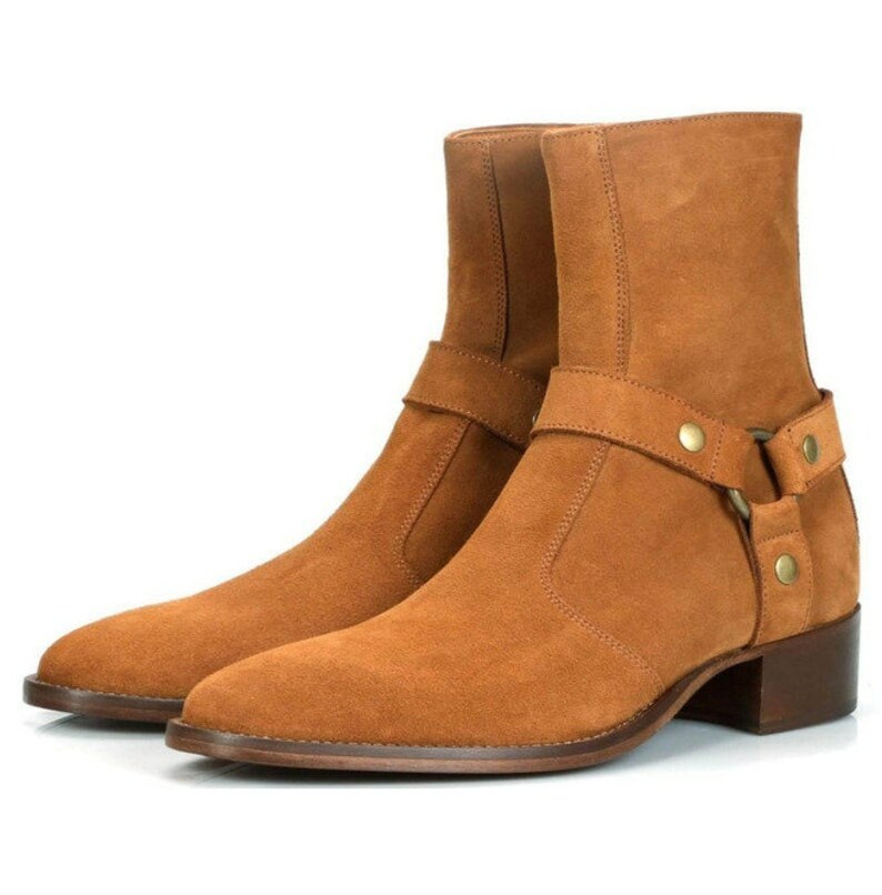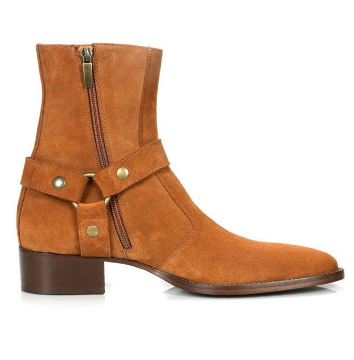 Handmade Men Tan Suede Leather Vincent Harness Side Zipper Boots With Cuban Heel