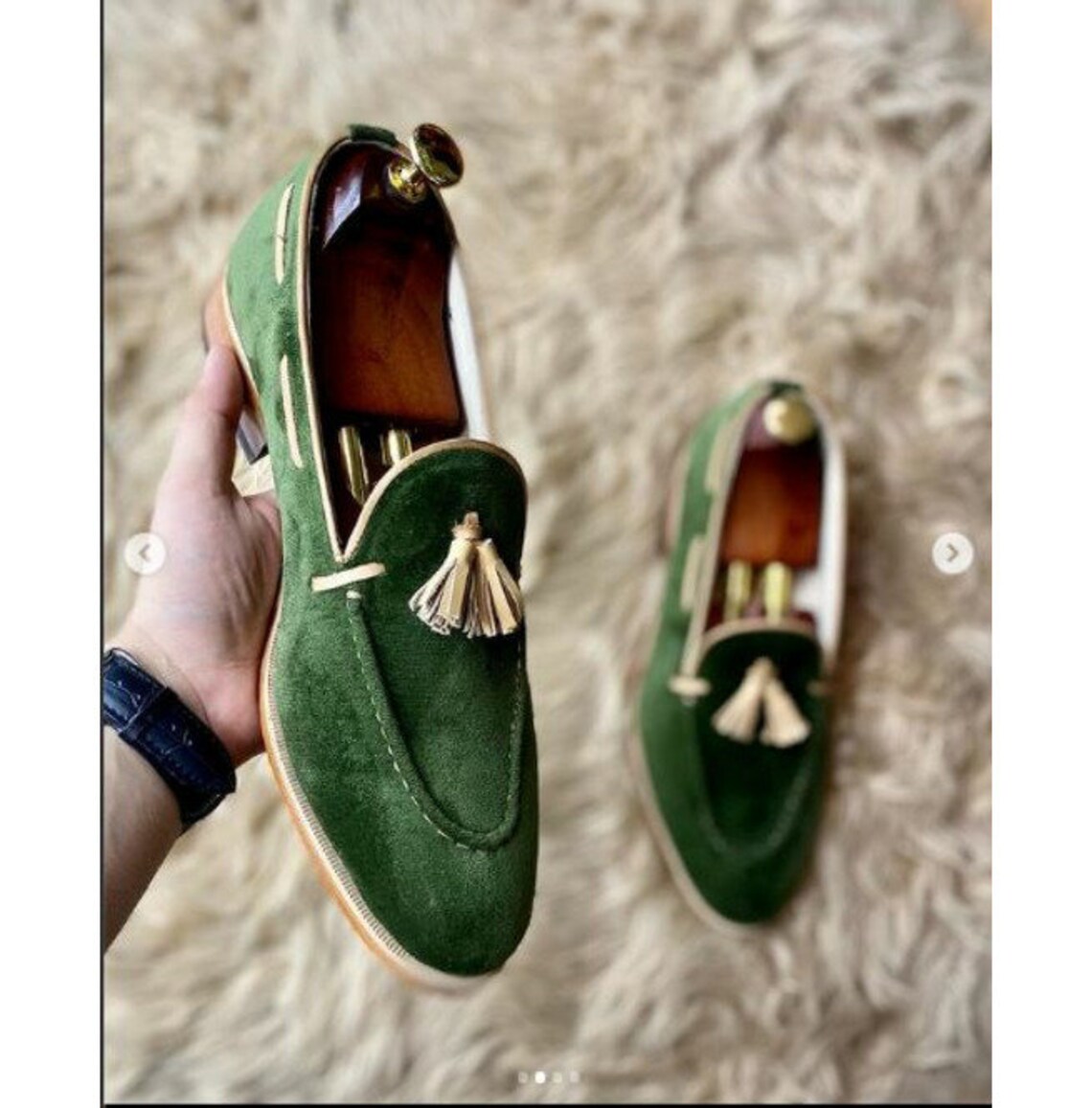 Men Handmade Green Suede Leather Loafer Shoes With Tassels, Tassel Loafers
